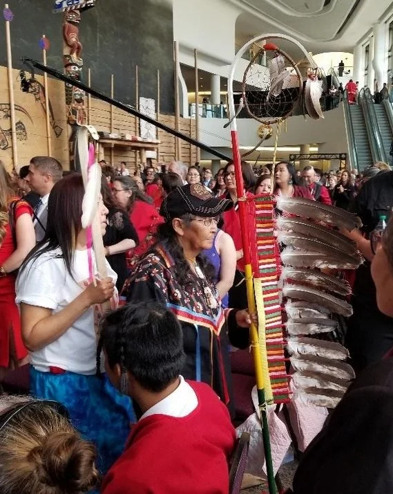 2Spirit Elder, Ma Nee Chacaby, carrying the MMIWG Inquiry eagle staff at the launch of the final report, Gatineau, Quebec, June 2019